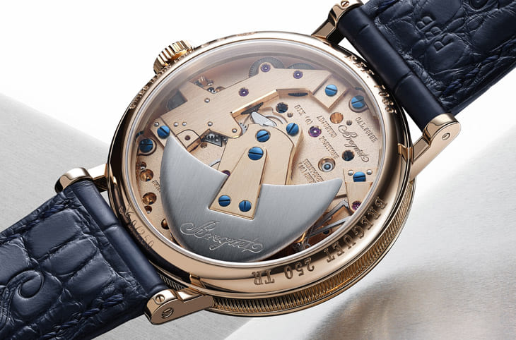 表壳用的是宝璣2025年新开发的「宝璣金」,它比一般黄金温润一点,又带点玫瑰金的感觉,视觉上很有层次。手表配上经典的表侧钱币纹与焊接式表耳,一整个就是强调「优质血统」的出发点,手表背面的透明底盖还额外刻上"BREGUET 250 YEARS"字样,提醒你这可是纪念限定版,身份自然和一般的款式有别。