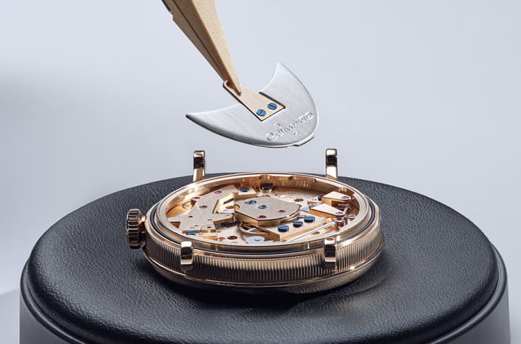 Tradition 7035的秒针是一大赏玩重点,一般而言手表的秒针不管是以中央为轴心或是偏置在小表盘上,它的运作方式都大同小异就是在重复绕圈,但是宝璣这款新作不同,它有个逆跳秒针,就在面盘左上角,这种设计不太常见,蓝钢秒针一走到刻度60就会瞬间弹回起点,看起来很有戏,而且秒针、面盘、螺丝一整套蓝得刚刚好,和金色调的机芯零件形成超强视觉对比,除了阅读时间轻松明瞭之外,还很赏心悦目。