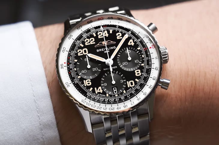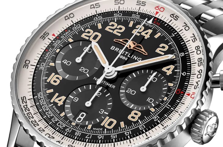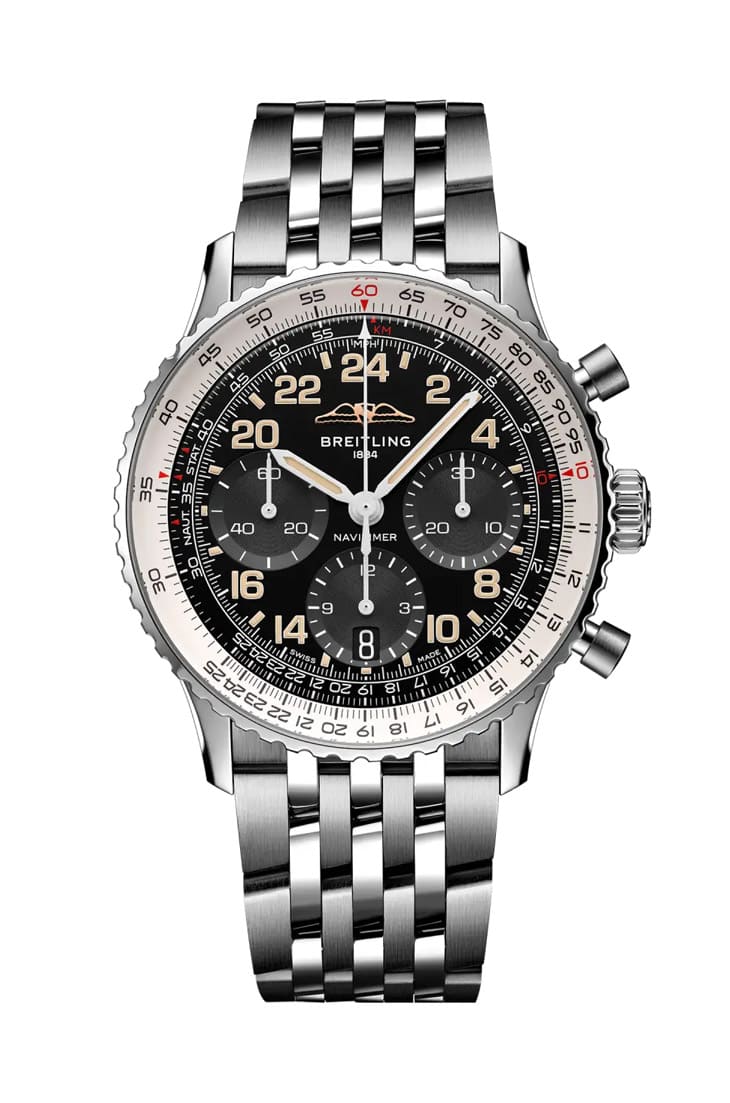 第一眼看到Navitimer Cosmonaute,会先被不锈钢与白金混搭的双向表圈吸引住,金属光泽带点奢华,但搭配黑面盘又显得非常稳重。整体直径41mm、厚度13mm,戴上手不会太压手,属于日常也能驾驭的尺寸。面盘部分,是这款表最有个性、最与众不同的地方,因为它用24小时刻度取代传统的12小时制,这不只是一个设计上的特色,更是源自实用需求,因为太空中难辨白天黑夜,时标採用了阿拉伯数字而且细致地分散于黑色面盘上,让人一眼就能掌握时间位置。面盘上还设有三枚小表盘,其中在6点钟方向的小表盘裡巧妙设置了黑底白字日期窗,整体融得很顺,不抢风采但提升实用性。至于中央的计时大秒针,採用清爽的白色,加上细红色刻度辅助,让飞行计算时更精准。面盘最上方是让Navitimer粉丝感动的那一抹飞翼AOPA标志(美国飞行员协会),这可是老味道的象徵。