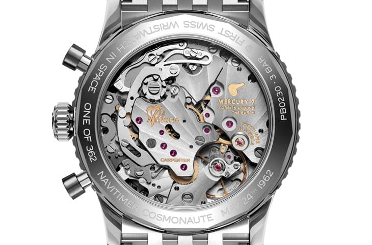 表背透明底盖下露出一枚乾净俐落、略显「肌肉线条感」的机芯映入眼帘,那就是百年灵自制的B02手上链机芯,它以经典的B01自动机芯为基础,去除了自动盘,变身为更轻薄、纯粹的手上链版本,而且特别调整为能显示24小时制。这枚机芯的规格很实用,例如震频每小时28,800次、动力储存达70小时、39颗红宝石轴承、导柱轮计时结构。导柱轮的设计让你按下计时按把时,有种明快的回馈感,不像凸轮机构那种软绵绵的手感,这种乾脆俐落,是计时表迷最爱的细节。B02机芯的装饰打磨并不走浮夸华丽路线,而是呈现一种工具机械的自信美学,如底板上有纵向日内瓦波纹,搭配特别鐫刻的太空任务徽标、Carpenter字样、太空船图腾等纪念图案等。有人说这枚B02只是把B01改成手上链而已,但实际佩戴起来你会发现,它的上链过程手感很扎实,动力储存也很够用,不会让人每天都要追着它转,而且少了自动盘,也更方便欣赏它内部机构的运作之美,简单来说,这是一枚为纪念、为专业、也为热血收藏家而打造的心臟。