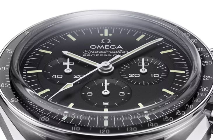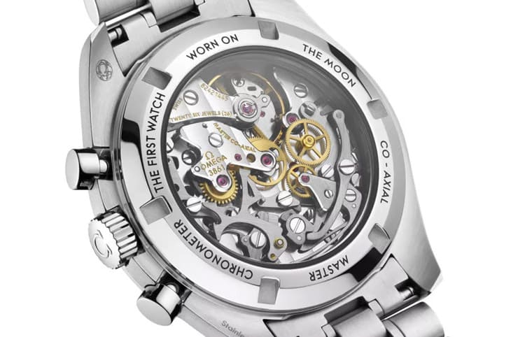 310.30.42.50.01.002的设计几乎是完美复刻1960年代第四代Speedmaster的轮廓,包含最具代表性的非对称表壳与表冠护肩设计,当年就是为了太空任务而生的实用性进化,这款表的表耳比前一代1861机芯款略微粗壮、间距更短,让整体感觉更紧凑,戴在手上更结实,而面盘的三眼计时盘配置则是一如既往的经典,其中一个有趣的细节是秒数刻度,旧款是五等份设计,现行款则改为三等份,对应机芯每秒6次震动的频率(3Hz),这样才能精确显示1/6秒,这个改动一开始让部分表迷有点不习惯,但从机械精准度来说,这是更合理的设计。另外,这代登月表的夜光指针与刻度涂料略带绿光,视觉效果上很复古,却又很实用。属于蓝宝石镜面版本的此型号,抗刮性强,还加了透明底盖,让你可以随时窥看它的机芯在努力运作的模样,这也是很多人选它而不选碳纤维玻璃胶镜面版的原因之一。