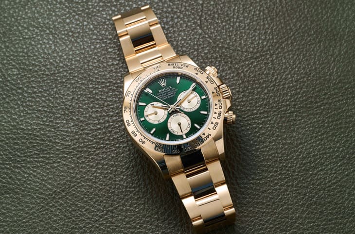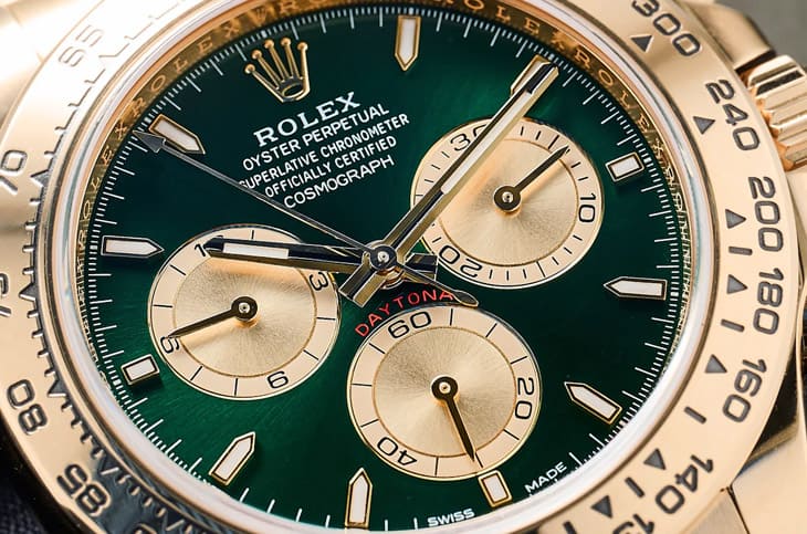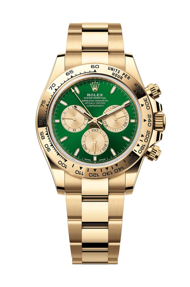 它保留了经典40mm黄金表壳和蚝式链带配置,整体比例熟悉又耐看,不过最吸睛的,还是那片绿色太阳纹面盘,平时在阳光下闪耀,暗处则沉稳内敛,加上全新金色喷涂计时小表盘,让整个面盘变得更有层次感,也更有1970年代的复古味。手表内部搭载Daytona系列新世代御用自动机芯,不但更省能、更耐震,走时稳定度也更上层楼。这只所谓的"John Mayer 2.0",无论是为了致敬、收藏还是日常佩戴,都有它引人入胜的理由。