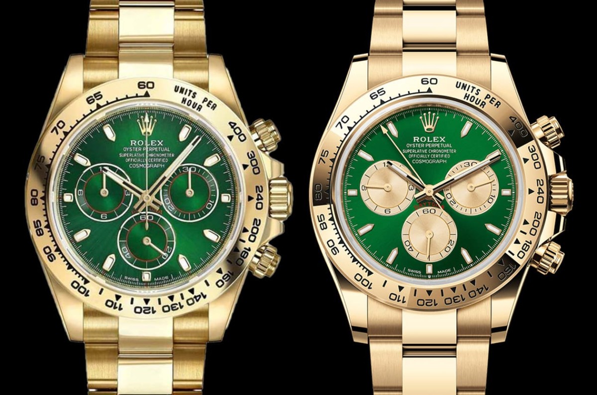 ▲上一代绿金迪116508(左)和新一代126508(右),虽然同样都是黄金表壳搭配绿色面盘,但是小表盘等细节已有不同。