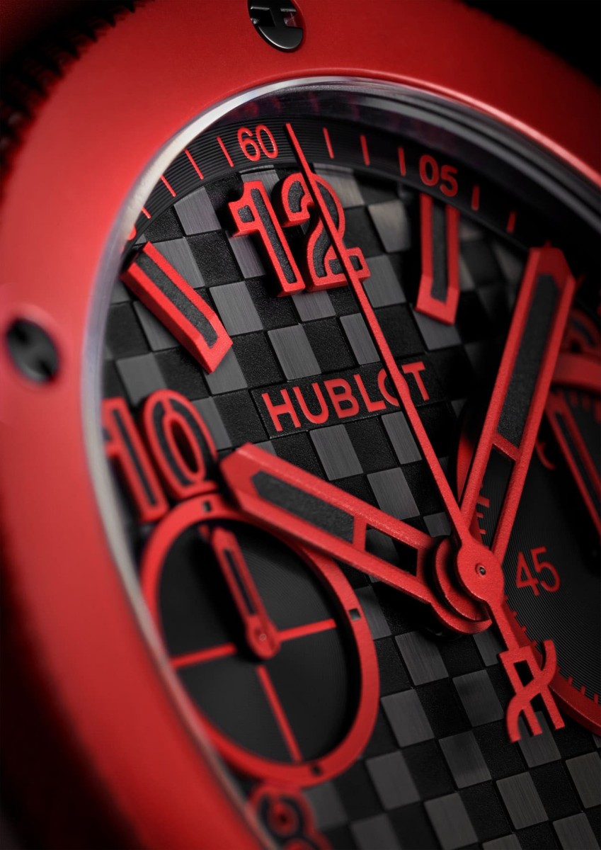 ▲鲜红陶瓷表壳搭配黑色细节,展现视觉张力。内缩式表耳、矩形按把及外露螺丝设计,呼应原版Big Bang经典元素。