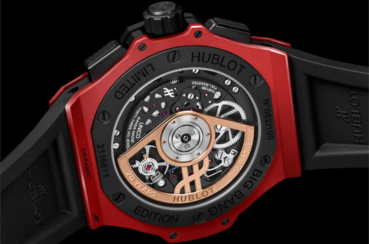 Big Bang 20周年UNICO限量版-魔力红陶瓷款内部搭载宇舶自制UNICO机芯家族的HUB1280自动飞返计时机芯,透过蓝宝石透明底盖,可以清楚看到精致打磨的机芯结构,以及22K金质镂空自动盘上特别鐫刻的"20 Years"、"BIG BANG"等纪念字样,这款机芯动力储存长达72小时,内部重要结构包括导柱轮与双水平离合机制,不仅计时操作手感流畅,且抗震性能也很优异。