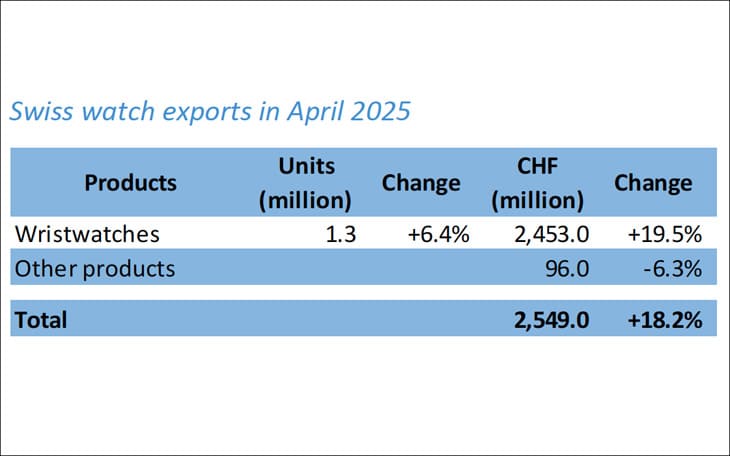 2025年4月,瑞士钟表业迎来了一波令人惊喜的出口成绩:单月出口130万只手表,出口额逾25亿瑞郎,比去年同期大涨了18.2%,这可不是什麼小成长,而是近年来相当少见的跳跃式表现,如此一来,瑞士手表在今年前四个月的总出口成长也推升到4%。