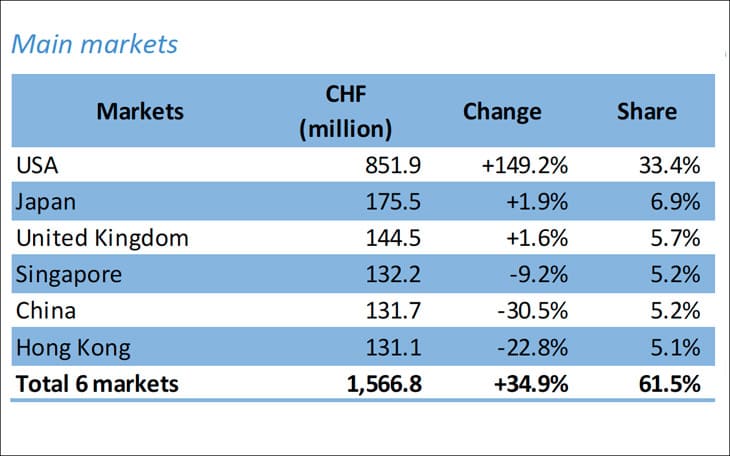 ▲2025年4月瑞士钟表产业在出口量与出口额方面都有突破性的成长,但是在漂亮成绩的背后,其实和单一市场的猛爆性成长有关。