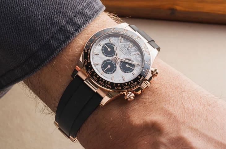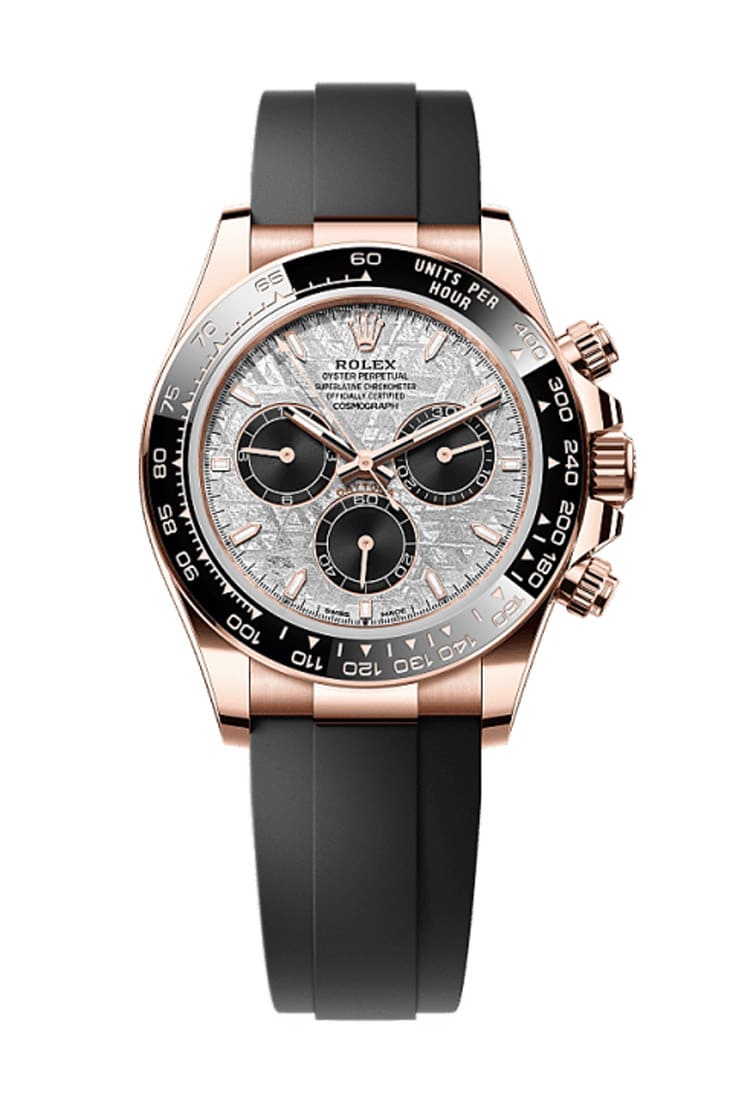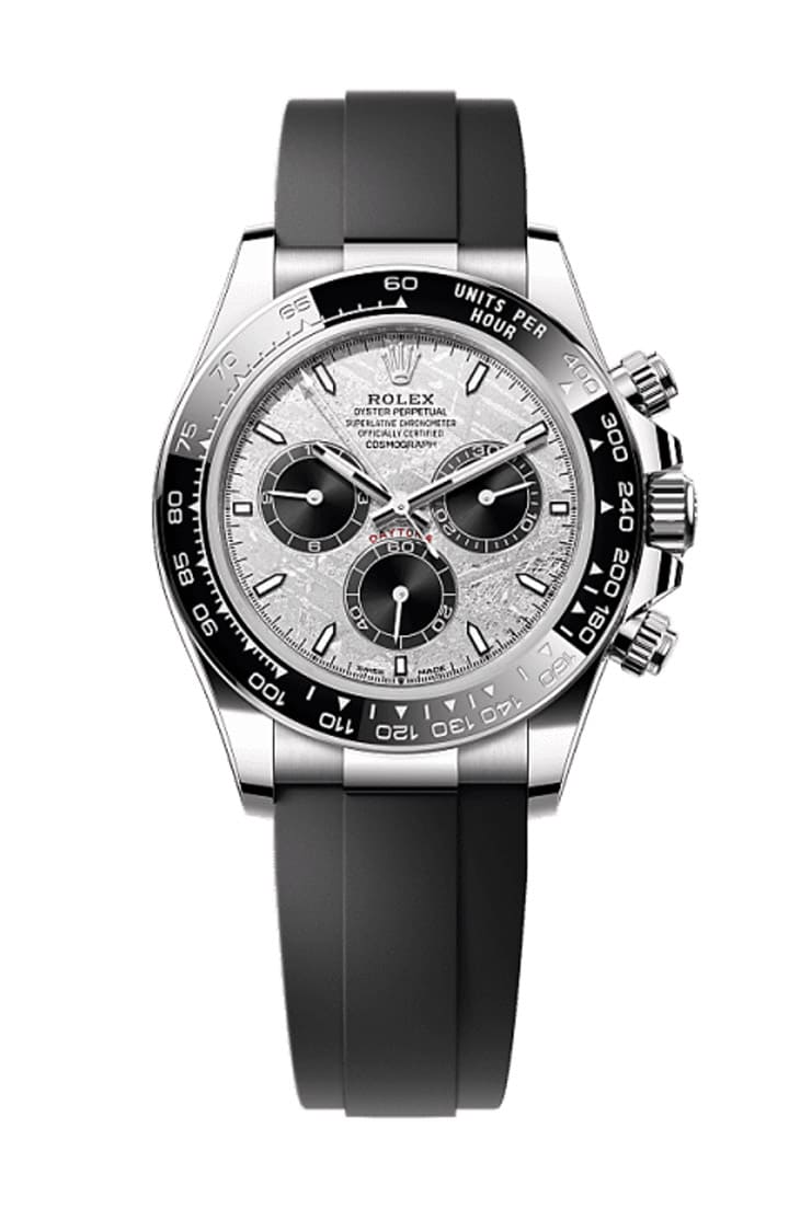 这批陨石面Daytona虽然是配置橡胶表带,但Oysterflex表带绝不只是为了运动风而妥协,这款表带内部嵌有金属片骨架,既保有橡胶的柔韧性,也具备金属链带的稳定支撑,内侧还有舒适垫层设计,加上Oysterlock保险扣与Glidelock延展系统,可无需工具微调长度,兼顾佩戴感与实用性。对于觉得「全金Daytona太闪」的玩家来说,这种配置其实更有魅力,一方面保留了贵金属表壳的份量与气场,另一方面透过橡胶材质平衡了整体外观,让它既奢华,又不流于炫耀。