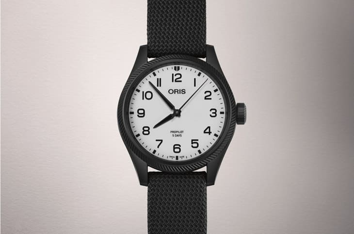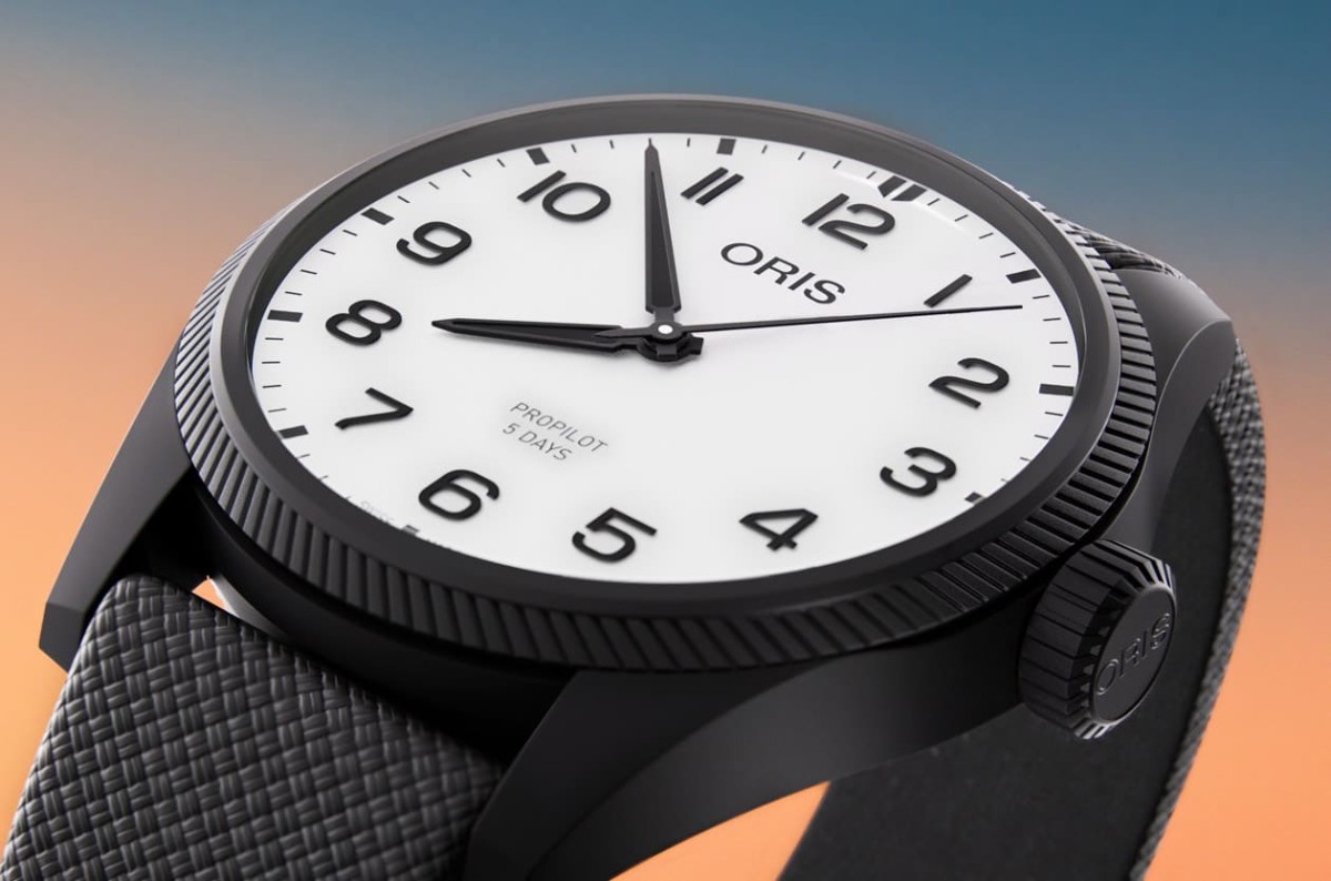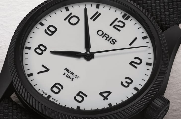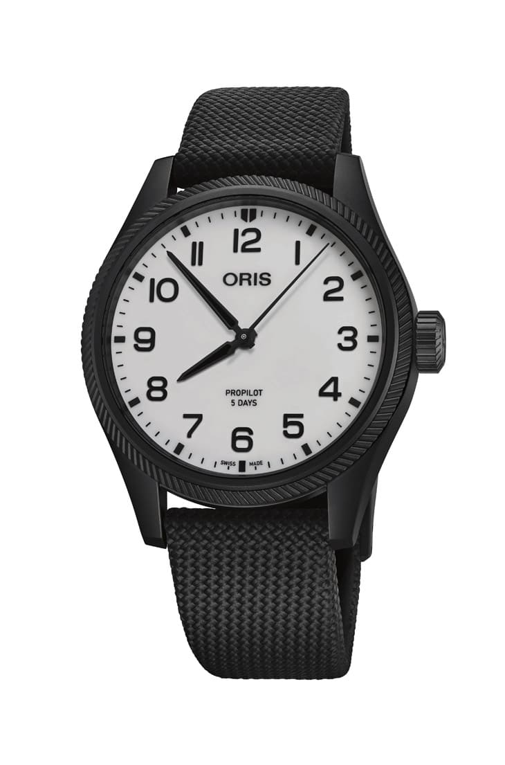 先看手表外观,整体是熟悉的ProPilot样式,其不锈钢表壳经过雾黑DLC处理,搭配黑色织物表带与同样黑化的"LIFT"飞机扣环表扣,设计非常具有一致性。这样的设计对ORIS来说并不稀奇,但进一步细看面盘,你会发现它跟过去有点不一样:整片白色面盘,搭配黑色的刻度、时标和指针,显得非常纯粹且对比强烈,虽然不是飞行表标准的黑色面盘,但意思也很到位了。