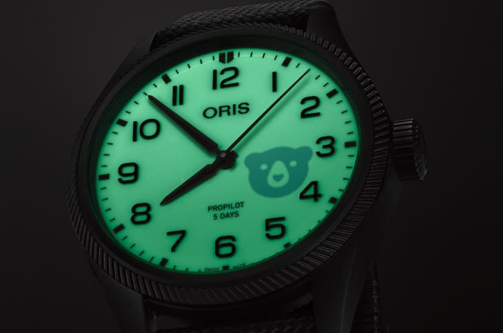 ▲身在黑暗环境中,整枚面盘会绽放绿色夜光,ORIS小熊也会悄悄出现在3点与4点间,是个令人惊喜的幽默细节。
