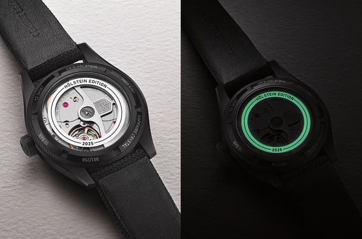 表背的设计也还有戏,透明底盖外围与表壳同样镀上黑色系,ORIS另外在蓝宝石水晶底盖外圈也加上了夜光涂层,还印有“Hölstein Edition 2025”的字样,平常看好像稀松平常,不过在暗处时,那圈夜光范围会变得格外抢眼,烘托它刻有个别编号与限量250只的稀有身份,收藏意义不言而喻。