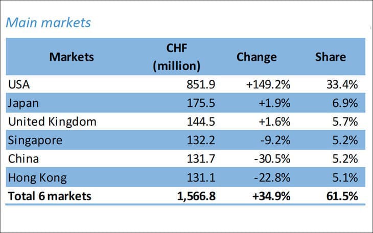 为了赶在可能高达31%的新关税实施之前,瑞士手表制造商竞相将库存运往美国,导致2025年4月出口额高达8.52亿瑞郎,是2024年4月(3.42亿瑞郎)的2.5倍!光是这一个月,瑞士就出口了130万只手表、总值超过30亿美金。这当中,美国市场的进口额暴增149%,可说是「先发制人」的表现。