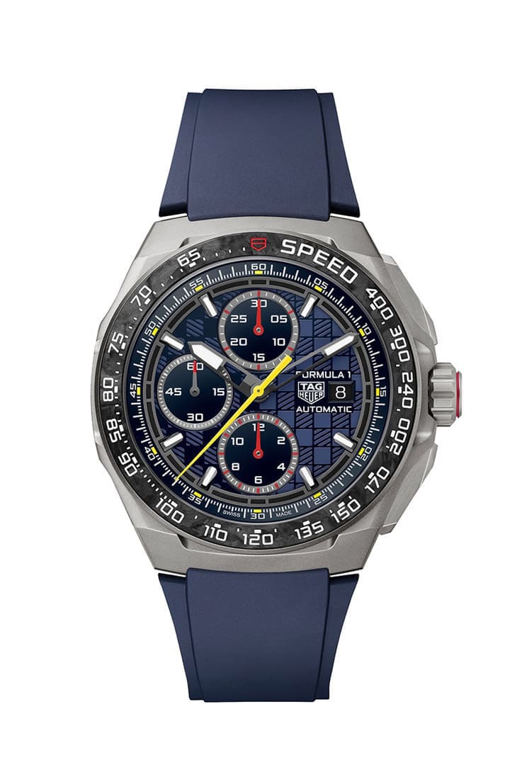 如果你是红牛车队的车迷,这款泰格豪雅根本就是为你而生,它以RED BULL的经典蓝色为主色,搭配黑色碳纤维表圈和细致棋盘格纹面盘,看起来很有速度感。钛金属表壳又轻又硬,完美体现了赛车对轻量化的追求,戴在手上有种Ready to race的感觉,最酷的是红色计时按把与黄色细节,把RED BULL车队的代表色彩玩得超到位。手表内部搭载Calibre 16自动计时机芯,稳定可靠,还有蓝色橡胶表带增添运动感,不管你是要戴去看比赛还是周末出游,都会显得相当有型。