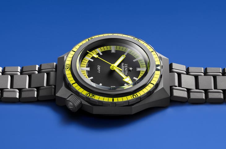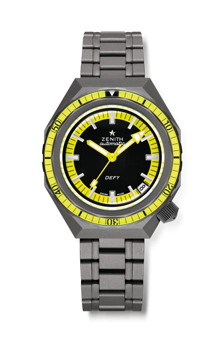 ▲DEFY Extreme Diver传承1969年经典潜水表外型,结合现代棱角线条与鲜黄细节,展现沉稳又动感的当代技术风格。