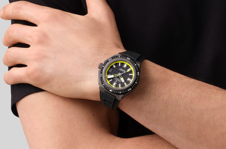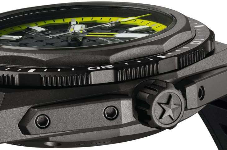首先看到第一款是DEFY Extreme Diver Shadow,这是一只设计上偏向专业用途的潜水表,从外观到规格都没在马虎,它的微喷砂钛金属表壳带出一种冷冽的科技质感,十二边形外圈搭配黑色陶瓷单向旋转表圈,完全延续DEFY系列刚硬线条,最抢眼的是面盘上的亮黄色刻度环,从面盘到夜光涂料细节,让整体在低调中又不失活力,甚至还带一点「深海探险者」的未来感。