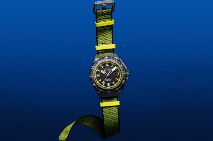 动力心臟则是真力时旗下可靠的El Primero 3620机芯,36,000转高震频理论上可以让走时更稳定,60小时动力储存则让它可以轻松应对周末不戴表的状况;更令人惊喜的是,这只深潜表竟然还保留透明底盖,让佩戴者能一窥抗磁设计与硅材质零件所打造出的黑色机芯风采,科技与机械美学兼顾。表款在佩戴体验上也展现了ZENITH的贴心设计:标配三条快拆表带,包括耐操的Cordura橡胶、钛金属链带,以及一款用回收渔网制作的黑黄织物表带,户外玩家应该会很爱这种一秒换风格的灵活性。