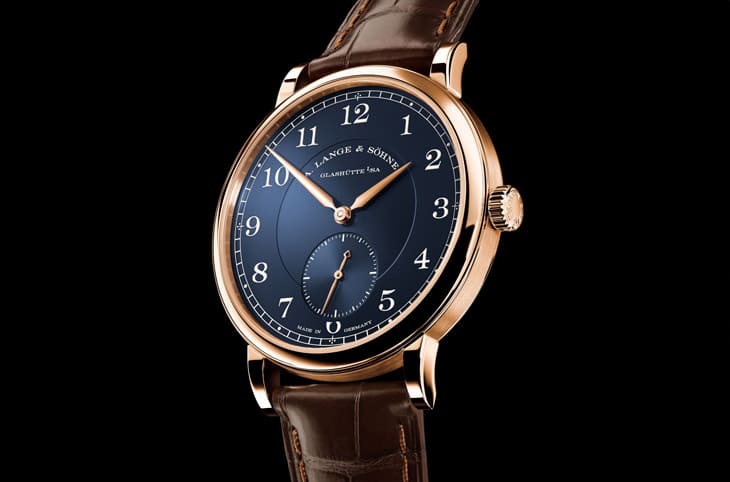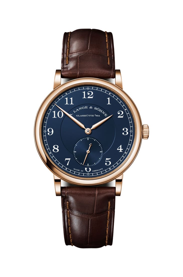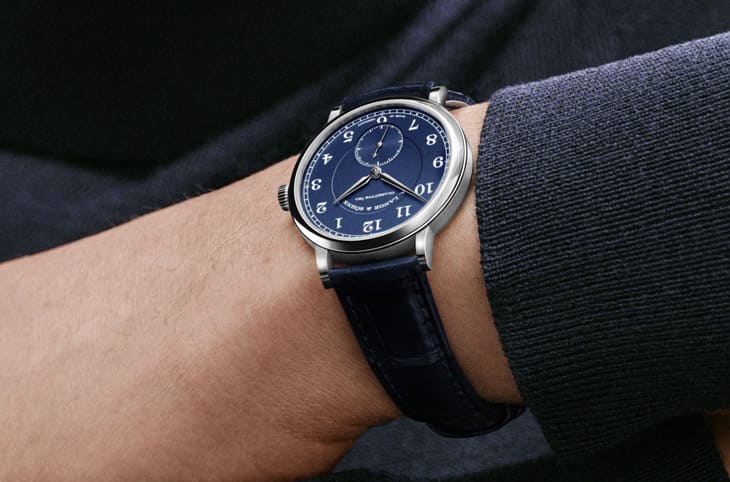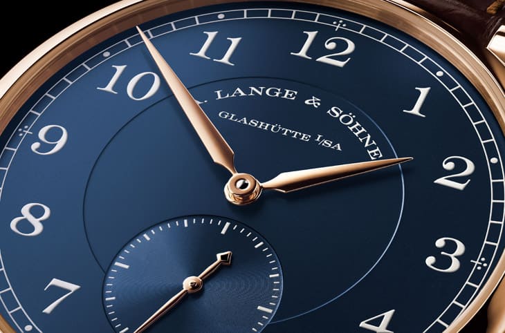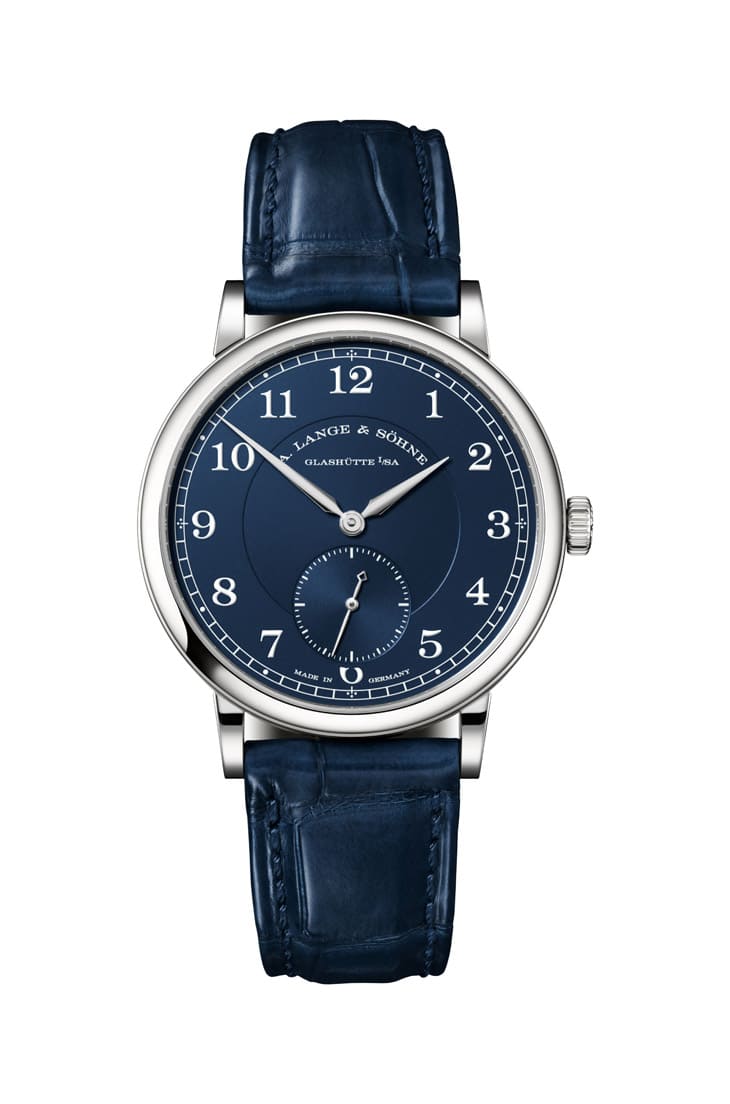 ▲蓝色电镀面盘以925银制成,搭配轨道式刻度、阿拉伯数字时标与小秒盘,金质叶形指针细腻锐利,展现朗格德式设计的严谨与精致。