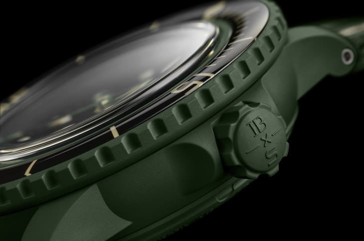 ▲Green Abyss採用深绿色生物陶瓷材质制成,融合米色与黑色细节,呈现深海般的神祕氛围,质地强韧又轻盈,佩戴舒适同时展现环保理念。