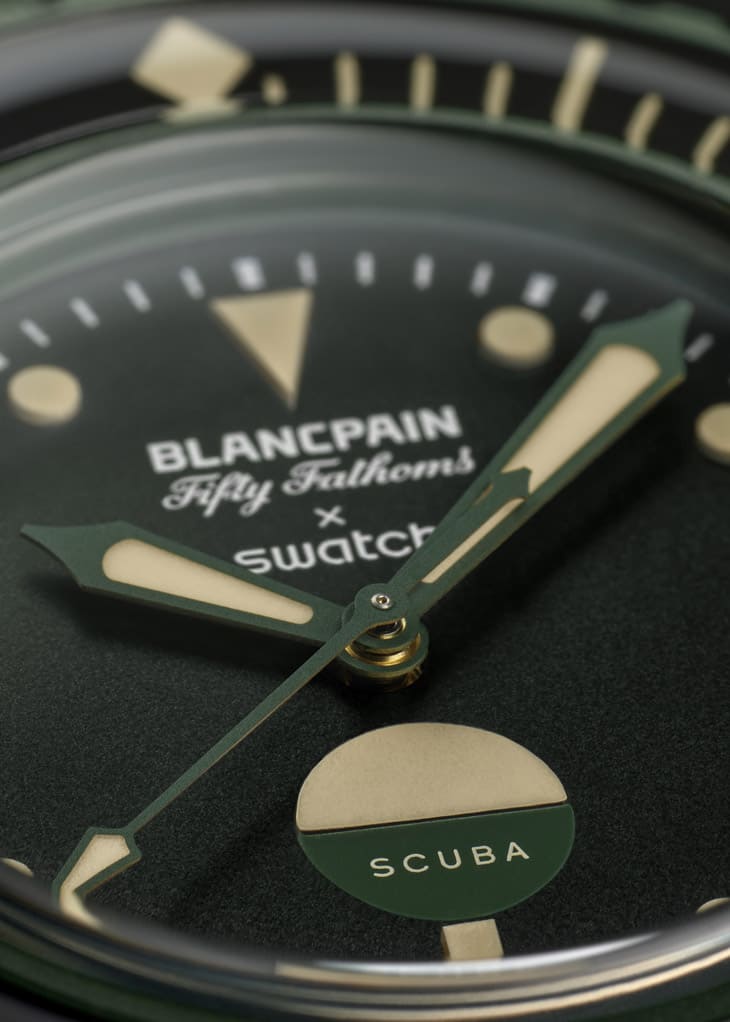 SWATCH与BLANCPAIN的合作还在继续进行中,新登场的Bioceramic Scuba Fifty Fathoms "Green Abyss"(下称Green Abyss),在2025年夏季前夕强势出击,以其深沉的翠绿色调与经典设计特徵,再次向宝珀1953年首款专业潜水表「Fifty Fathoms五十噚」致敬。