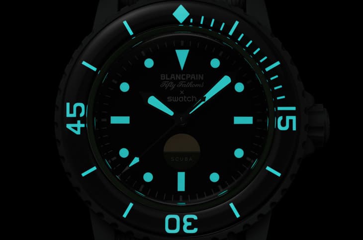 新作最具话题的亮点莫过于面盘6点钟方向的湿度指示计,它的渊源来自BLANCPAIN的MIL-SPEC系列,这项装置能在表内湿度异常时变色提示,强调其潜水表本格的专业性,加上单向旋转表圈与高规格防水性能(50噚,约91米),绝非只是玩票性质的联名设计。