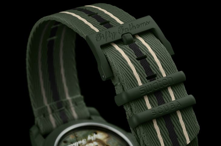 机芯背后的视觉设计也是一大惊喜,SWATCH用数位印刷的Felimare Picta海洋裸鳃类动物图案色彩也是以深绿色和米色为主,展现海洋生命的绚丽与神祕,这种被称为「皇家海女神」的生物,是对海洋保护重要性的温馨提醒,加上表背边缘鐫刻的五句标语,如"PASSION FOR DIVING"、"OCEAN BREATH"等,不只是装饰用而已,更像是对潜水人心声的共鸣回应。