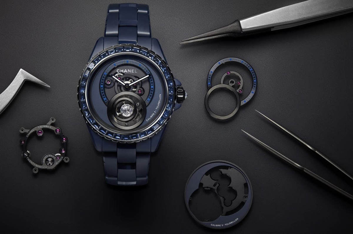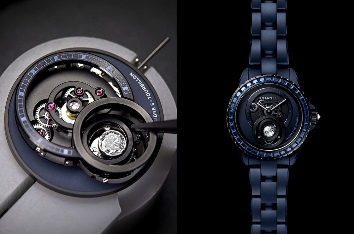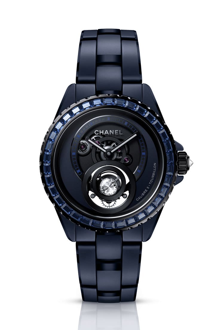这款腕表以其精湛工艺,成为蓝色陶瓷系列中的「皇冠之珠」。高抗磨雾面蓝色陶瓷表壳与链带,搭配黑色涂层精钢元素,表圈镶嵌34颗总重约4克拉的长阶梯形切割蓝色蓝宝石,光芒璀璨,腕表最大的亮点莫过于面盘上可见的飞行陀飞轮,框架上镶嵌独特切割钻石,精致机芯运作透过蓝宝宝石水晶底盖一览无遗,彰显香奈儿高级制表领域的技术实力。这款腕表搭载品牌自制Caliber 5手动上链飞行陀飞轮机芯,具备约42小时动力储存,不仅精确运转时间,更是一件结合陶瓷美学与顶级珠宝镶嵌工艺的高级制表珍品。