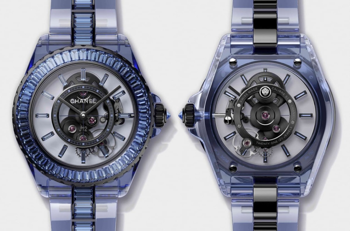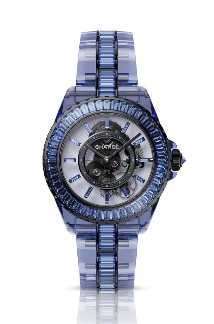 若说陀飞轮款是陶瓷美学的颠峰,X-Ray则是材质极限的试炼场。J12 Bleu X-Ray腕表将材质创新的精神推向高峰,是一款名副其实的「透明奇迹」。这款腕表的表壳与链带完全由罕见的蓝色蓝宝石水晶精雕细琢而成,展现了香奈儿处理极坚硬材质的非凡技艺,蓝色蓝宝石水晶的独特蓝调是经过特殊研发,将蓝色粉末染料注入透明蓝宝石水晶块中,混合铁、钛和少量钾而得以实现,其通透特质,使得搭载的自制Caliber 3.1手动上链机芯的精妙结构尽收眼底。而在面盘、表圈和链带上搭配镶嵌的天然蓝色蓝宝石,在透明蓝宝石水晶的映衬下,呈现出含蓄而迷人的光影变化,再次证明香奈儿在材质与美学结合上的无限创意。