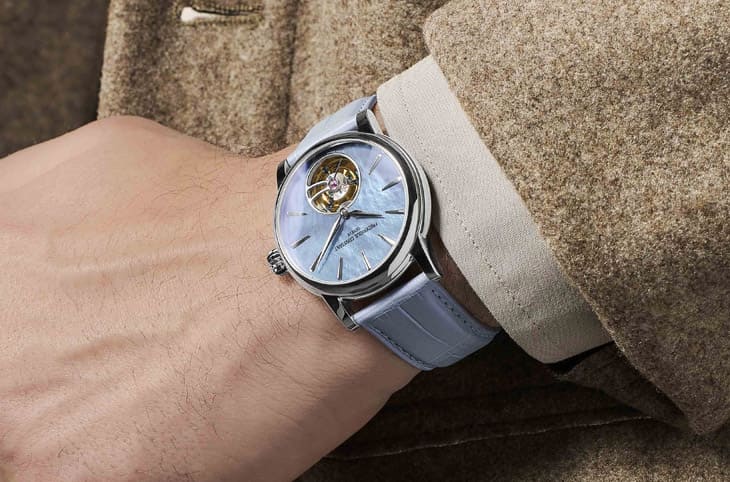 ▲面盘选用天然灰蓝珍珠母贝制成,随光折射展现独特虹彩与层次,极简配置突显材质之美,搭配立体时标与6点钟方向的陀飞轮,营造出低调而深邃的视觉张力。