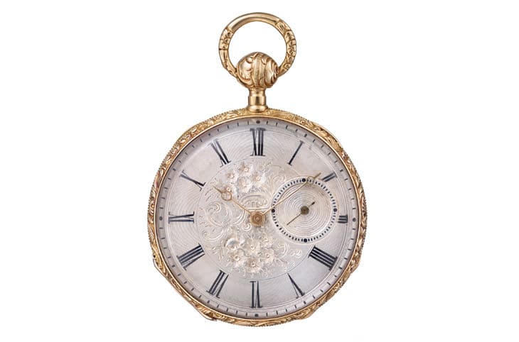 ▲1938年制怀表,18K黄金材质,金雕与凿雕,二问功能。