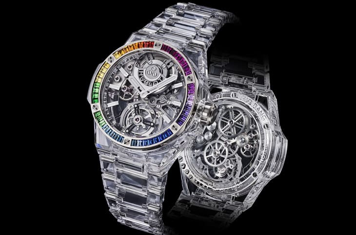 ▲宇舶彩虹蓝宝石陀飞轮全球限量30只,配透明蓝宝石链带与48颗彩虹宝石表圈,搭载自制HUB6035机芯,市价约25万美金。Source:The Hour Glass