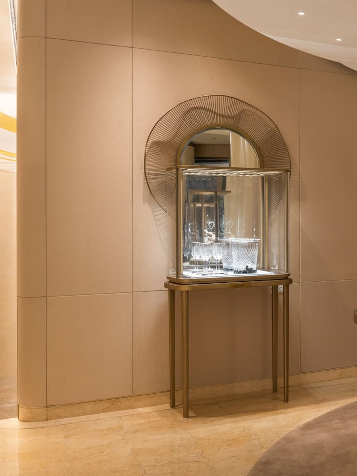 现场展出包括镶嵌钻石、祖母绿和縞玛瑙的鸡尾酒钻石精细珠宝手表,其表带由不同几何形状的链节组成,极具精致与多变的外观。更令人惊嘆的是罕见的高级摆件「冰雪美洲豹」香檳杯组。这套作品展现了极为珍稀的宝石雕刻工艺,雕刻师需极度专注地驾驭材质,使其在不损坏宝石分毫的前提下,精准地实现珠宝设计师的构想。卡地亚是全球唯一在品牌内部设立宝石雕刻工坊的珠宝商,这项工艺的复杂性可见一斑,香檳杯本身更是与法国最古老的水晶制造商SAINT-LOUIS合作,每只杯子都由专家手工吹制、拉伸、雕刻和拋光,其品质要求之高,据称每生产100只才能供应16只完美的杯子,尽显卡地亚对优异品质的坚持与追求。