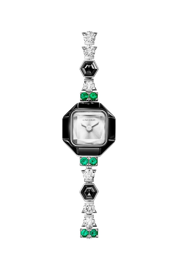 18K白金材质/石英机芯/时、分显示/表款镶钻70颗,约重2.18克拉、祖母绿12颗,约重0.28克拉/蓝宝石水晶镜面/防水30米/表径12.9x12.9mm/参考价:NT$ 2,400,000