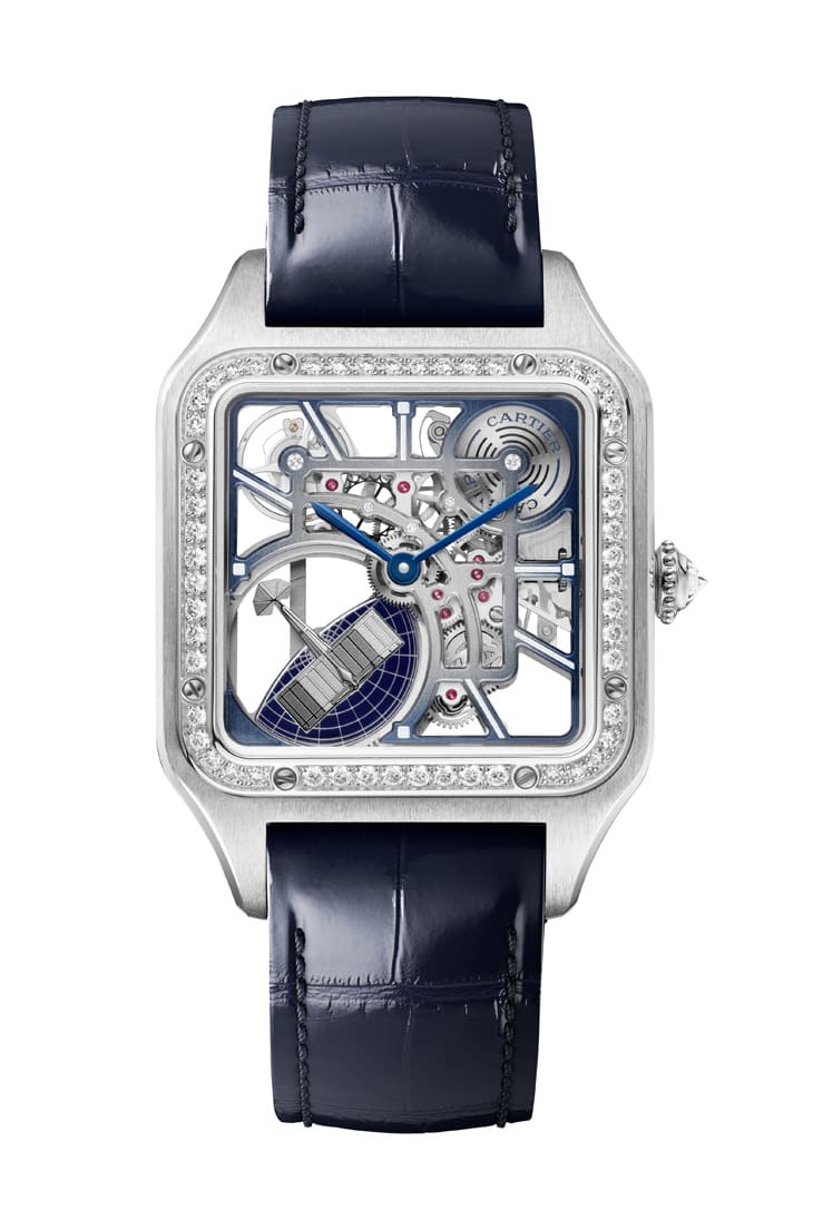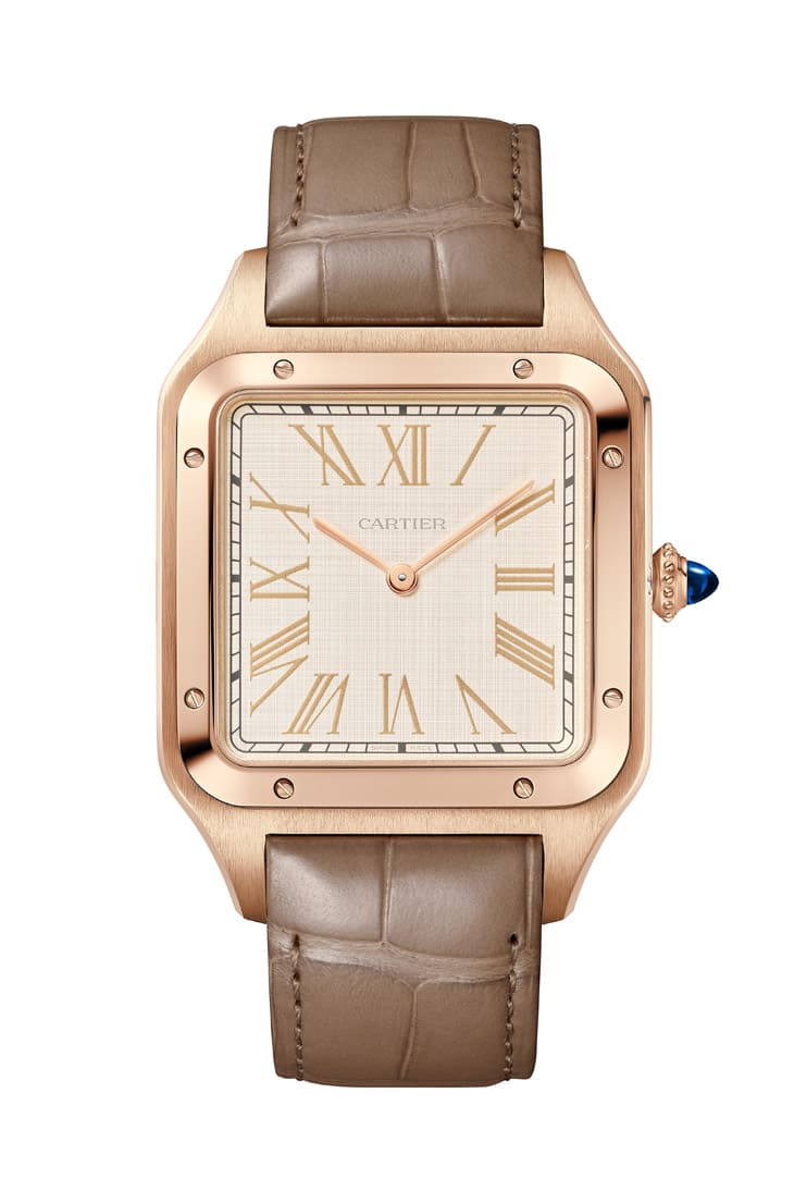 此次展览聚焦于6月新问市的Santos-Dumont超大型限量表款以及Santos de Cartier全新小尺寸款式,其中Santos-Dumont超大型表款延续纤薄优雅的设计,特别推出三款不同材质的版本,分别以飞机结构的木质、机翼的亚麻和金属零件的铜制元素为灵感,透过精密的黄铜基板、雷射加工或压印纹理,再结合电镀与涂漆工艺,巧妙呈现出独特的面盘质感,例如,黄金版本以木质纹理呈现,玫瑰金则带有亚麻质感,铂金款则展现光滑缎面效果。