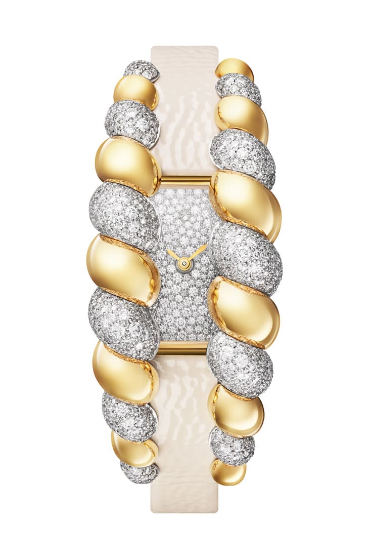卡地亚将珠宝工艺与制表工艺和谐融合,创造出超越传统的艺术品,其中,Tressage手表便是一个绝佳范例。卡地亚珠宝与钟表创意总监Marie-Laure Cérède称其为「第三类」时计,它既非手环,也非简单的皮革表带,而是将手表的经典元素以夸张放大的艺术手法演绎,超大尺寸的表耳优雅延伸,化作缠绕于腕间的华美立体链带。Tressage系列新作延续了卡地亚对黄金工艺、立体感与对比效果的重视,透过黄金、白金以及钻石与蓝宝石镶嵌等多种版本,将手表提升至雕塑艺术的层次。这也呼应了1933~1970年间创意总监贞杜桑(Jeanne Toussaint)对黄金复兴的推动,她善用各种方式塑造黄金,创造出丰富而充满感官魅力的立体作品。