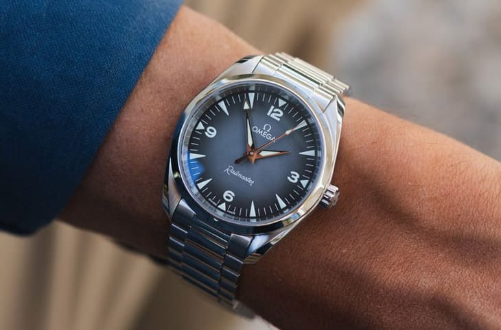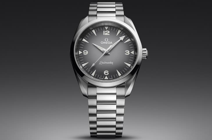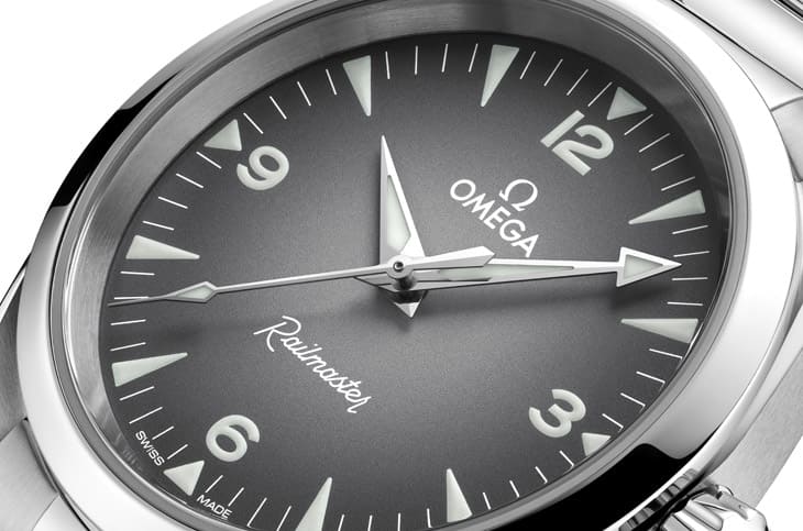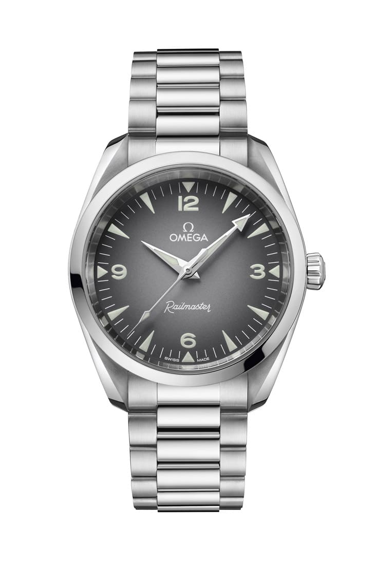 Railmaster过去给人一种务实、工业感强烈的印象,但这款新版本换上灰色渐层面盘后,整体视觉更显高级而深邃。面盘从中央浅灰向外过渡至几乎近黑的深灰,透过雾面处理,展现一种柔和又极具层次的质感,完全没有反光干扰,让整体读时体验相当纯粹。面盘布局走极简路线,除了OMEGA标志与“Railmaster”字样之外,几乎无多餘文字点缀。阿拉伯数字与三角形时标以白色Super-LumiNova填充,日间视认性清楚,夜间更能分别发出蓝光(时标)与绿光(指针),这种双色夜光配置不仅好看,也在黑暗中更容易分辨指针与刻度位置。值得一提的是,指针设计採用了箭头形状,拋光处理搭配雾面背景,阅读时间不费力,整体风格给人一种「我没说话,但你知道我很厉害」的感觉,非常符合铁霸那种低调但专业的气场。