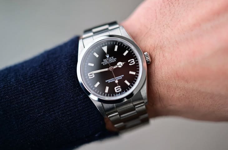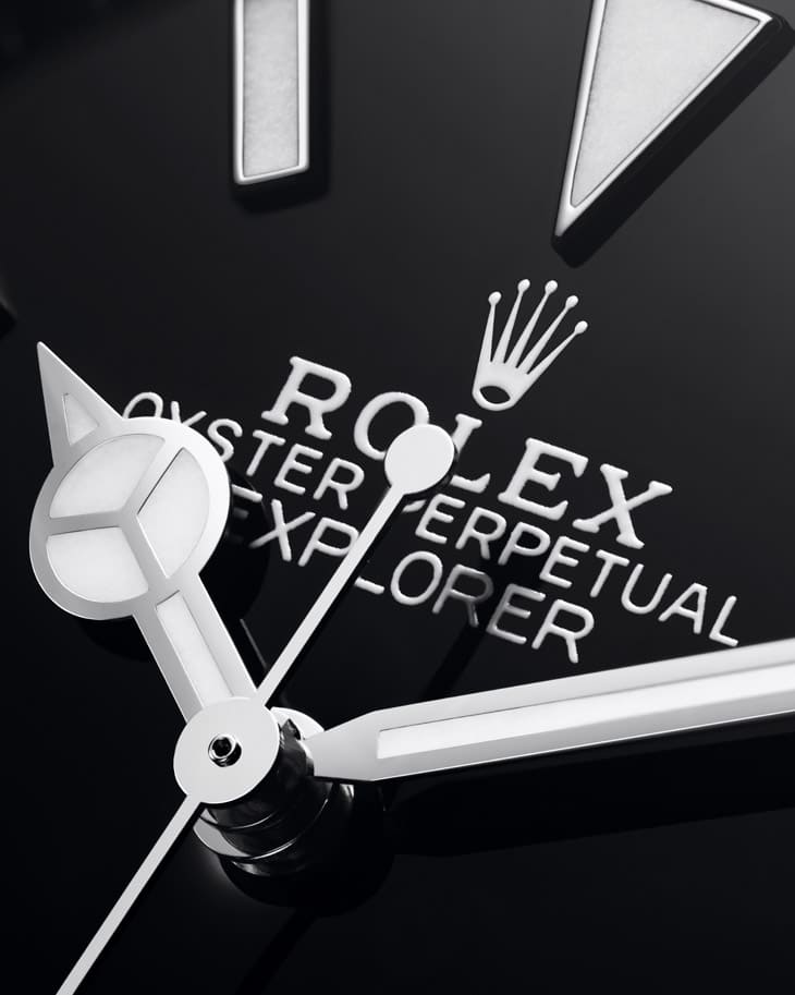 如果说探一有什麼不能妥协的元素,那一定是它的黑色面盘和3-6-9阿拉伯数字时标。这组布局几乎是Explorer的DNA,从1950年代以来就没离开过,124270延续了这项传统,亮黑漆面配上18K白金嵌入时标与指针,在细节中藏着大气与专业。指针与时标皆涂有Chromalight夜光涂料,能发出劳力士专属的蓝光,在暗处阅读一样清晰。指针比例调整得恰到好处,整个视觉感觉非常乾净、清爽。那次改款把"Explorer"字样回复到品牌标志正下方,这一细节看似不经意,实则让整体排版更加均衡,也让人想起最初那些Pre-Explorer年代的设计语言。这只表的面盘没有多餘装饰、没有日期窗,也没有花俏纹理,但正是这种极简设计,让它成为历久弥新的工具表范本。Explorer不靠繁复吸引注意,它靠的是历史、功能与设计比例三者达成完美平衡。