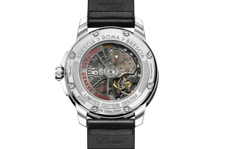 ▲透明底盖展现机芯运作,自动盘模拟赛车方向盘造型,并刻有赛程路线与限量编号,致敬Mille Miglia传奇。