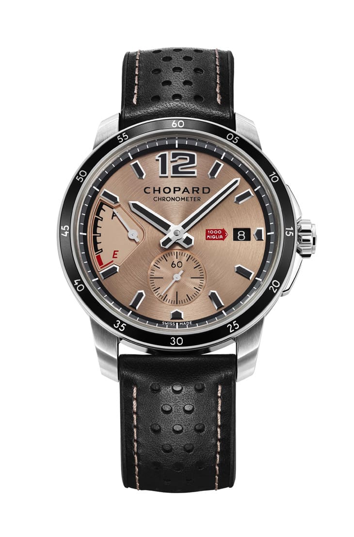 除了传统的6点钟方向小秒针与3点钟方向的日期窗外,这款表最有辨识度的特色,还包括8~10点钟之间的动力储存显示,其设计灵感来自老式油表,不只造型别致,也让人一眼掌握动力状态,这样的细节设计可谓画龙点睛,手表具备60小时的动储来自萧邦自制01.02-M机芯,经瑞士官方天文台(COSC)认证,走时精准,并具备停秒功能,方便进行秒级校时。