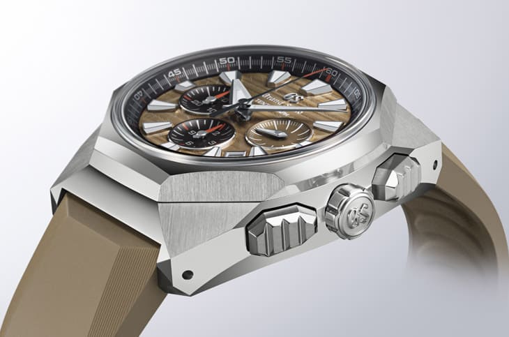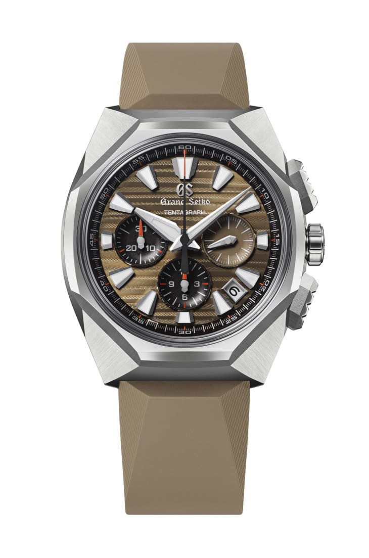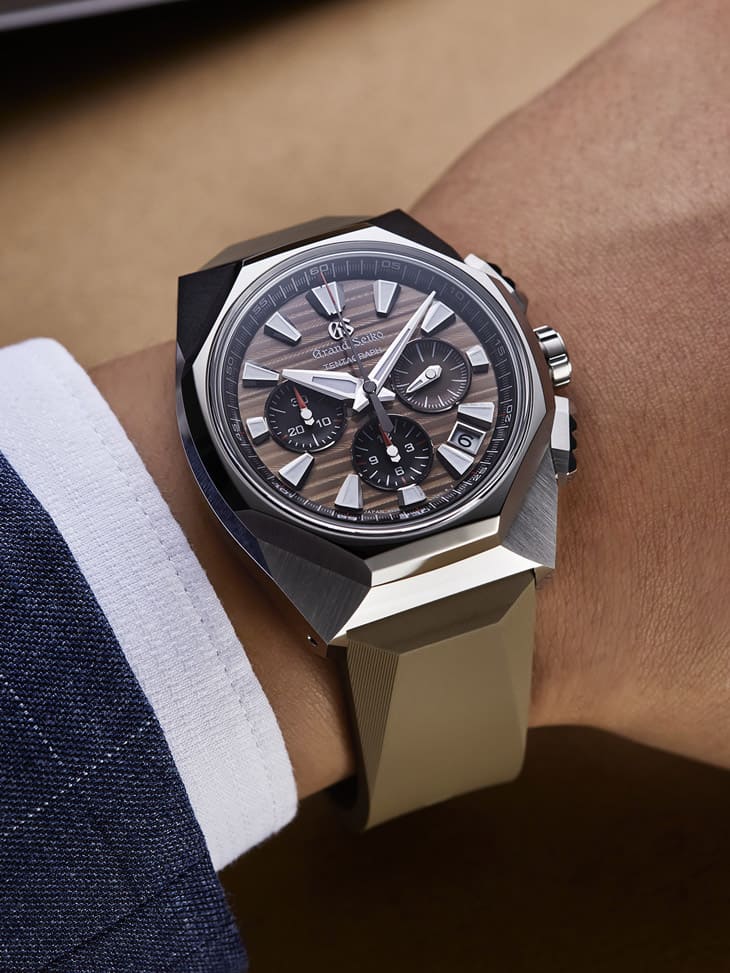 面盘设计更是亮点,灵感来自狮鬃随风飘动的律动感,配上在3点钟、6点钟和9点钟方向的立体下沉式计时小盘与钻石切割时标,既有视觉张力又兼顾实用易读。这款表搭配高强度棕色橡胶表带与浮雕狮掌图样,整体细节贯彻GRAND SEIKO对设计与佩戴感的双重要求。