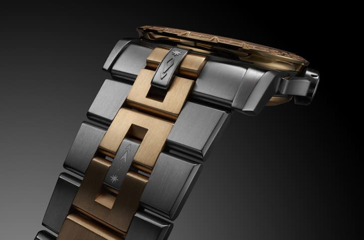 这只手表选用五级钛金属与18K玫瑰金打造表壳,材质对比强烈但不突兀,透过缎面与拋光交错处理,形成极具层次感的外观;更令人玩味的是,表圈与链带中段链节上出现了一连串看似「外星象形文字」的雷射雕刻,乍看像是来自遥远星系的密码讯息,为这款表增添一丝神祕气息。