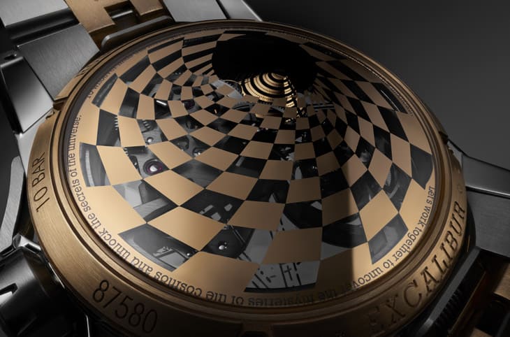▲透明底盖饰有棋盘格螺旋图腾,象徵时空扭曲,玫瑰金边缘鐫刻星际讯息,强化整体宇宙叙事与艺术气息。