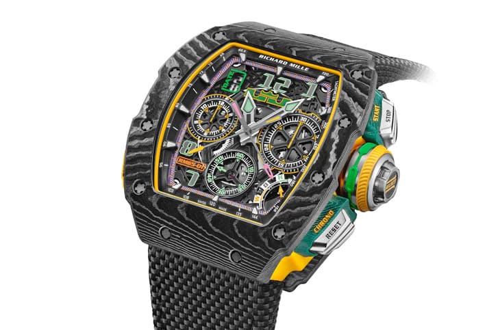 Carbon TPT碳纤维、黄色Quartz TPT石英纤维材质/RMAC4自动上链机芯/时、分、小秒、日期显示/追针计时码表功能/表冠功能选择显示/蓝宝石水晶镜面、透明底盖/防水50米/表径49.94x44.5mm/限量150只