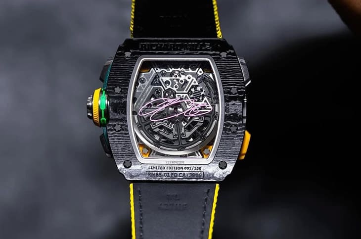 限量发行150只的RM65-01,是以RICHARD MILLE最复杂的自动计时码表为基础,并为LeBron融入量身打造的专属设计。整体风格承袭RICHARD MILLE代表性的运动科幻感,表壳採用轻盈坚固的黑色Carbon TPT碳纤维与黄色Quartz TPT石英纤维,带来极具冲击力的视觉效果。手表的黄紫配色明显是要向LeBron James目前效力的洛杉磯湖人队致敬,连按把、表冠、计时指针与测速计刻度等(透明底盖上另有LeBron James的紫色签名字样),都围绕湖人主题精心搭配顏色。