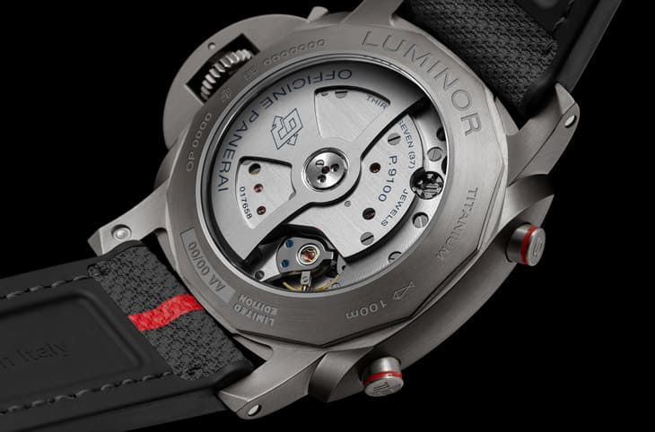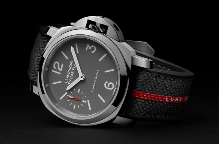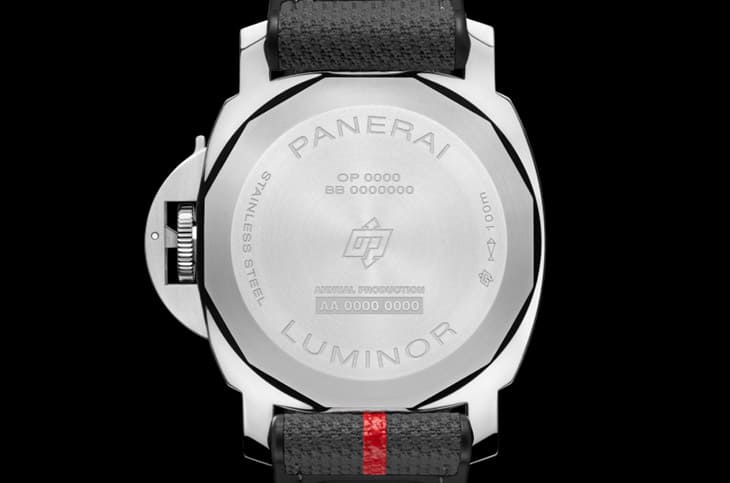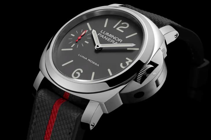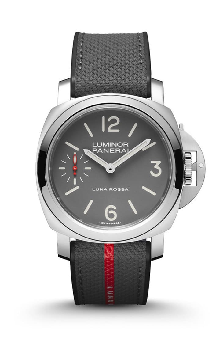 ▲PAM01653採用高纯度不锈钢打造,灰色三明治面盘简约有层次,红色细节与夜光涂层突显Luna Rossa联名风格。