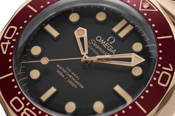 如果说青铜金是这款表的骨架,那它的灵魂就是那些经过深思熟虑的设计细节。最抢眼的莫过于勃根地红色铝圈,这是海马潜水300米系列第一次使用这个顏色的表圈,红得沉稳却饱和,和暖金色的表壳组合出一种几乎带点葡萄酒感的优雅层次,视觉张力十足。而手表面盘也不再是系列令人熟悉的波浪纹,改用雾面黑色喷砂铝面,搭配浅棕色印刷字体与米黄色夜光涂层,让整体更具怀旧氛围,此外指针与时标的拉丝处理,也同步呼应了整体的低调质感。欧米茄特意取消了这款的日期窗,这点虽然可能不是每个人都习惯,但对于追求对称与纯粹的人来说,这样的「留白」反而更显乾净俐落,还有表壳10点钟方向的排氦阀门,在青铜金壳体的包覆下,不仅更流线,与整体色的调协调度也更高了。