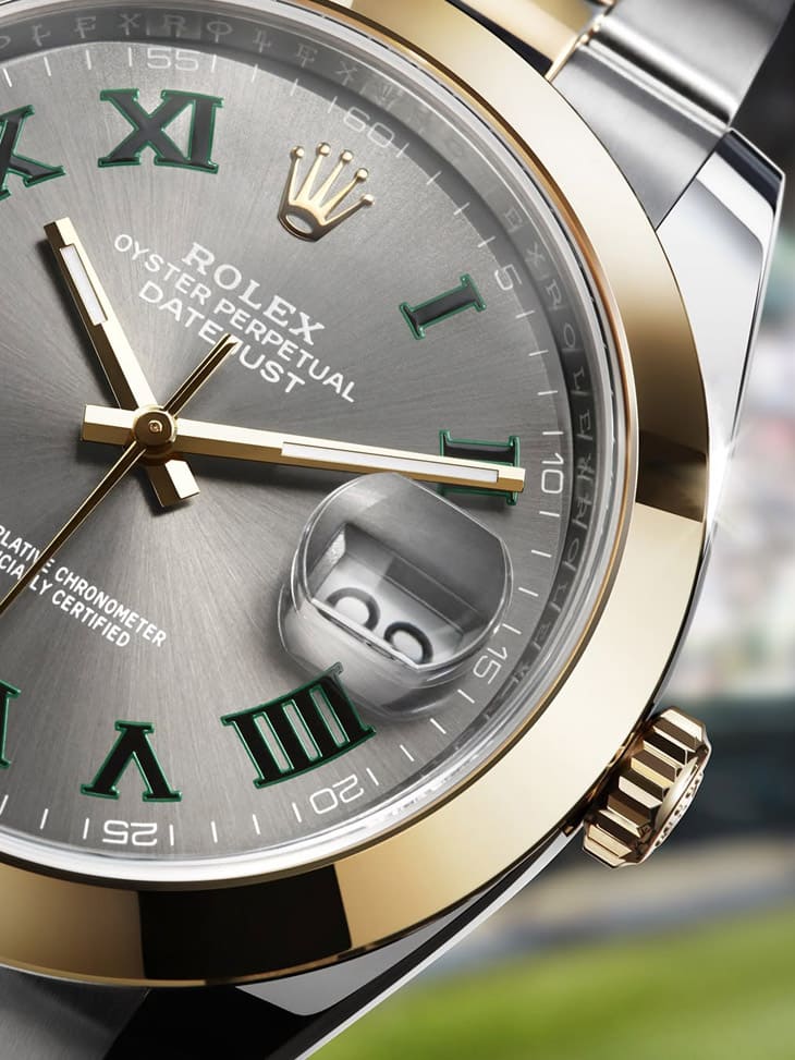这款面盘的首次登场,要回溯到2009年。当时,劳力士在(还叫做)Datejust II的系列中推出了型号116333,首度搭载以板岩灰太阳纹为底、绿色勾边罗马数字为时标的设计,这个组合乍看低调,却越看越耐人寻味,板岩灰的稳重、搭配网球绿的轮廓线条,刚好呼应温布顿球场草地与传统色彩,连结就此悄然建立。这款初代「温布顿」手表以41mm不锈钢与黄金异材质打造,配备坑纹表圈与蚝式表带,展现出既经典又现代的风格。即便罗马数字时标本身是黑色,但绿边细节让它在光影中拥有截然不同的表情。