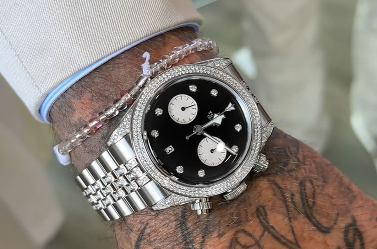 ▲仅此一只的钻石Black Bay Chrono为帝舵为贝克汉打造的生日礼,表圈、链节镶钻,面盘极简,据传日期窗还藏有独特设计。Source:Adrian Barker/Bark and Jack