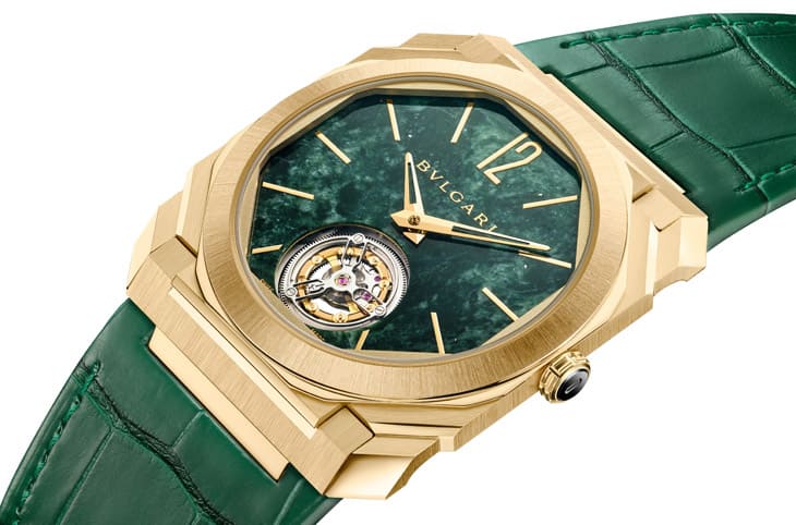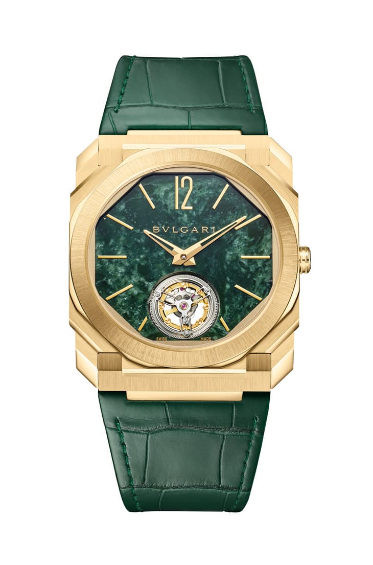 ▲Octo Finissimo Marble Tourbillon搭载厚度仅4.85mm黄金表壳与翠绿大理石面盘,展现义式建筑美感与超薄工艺,限量30只