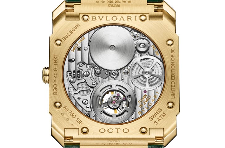 这款表的表壳直径40mm、厚度仅4.85mm,採用缎面拋光黄金材质,搭配同色系的指针与时标,还有一条墨绿色鱷鱼皮表带。表壳内部搭载的是宝格丽自制的BVL 268手上链机芯,厚度仅1.95mm,动力储存达52小时;值得一提的是,这枚机芯其实早在2014年就打破过世界纪录,现在再被应用在如此高难度的作品中,足见其稳定与可靠性。Octo Finissimo大理石超薄陀飞轮限量30只,收藏价值自然不在话下。