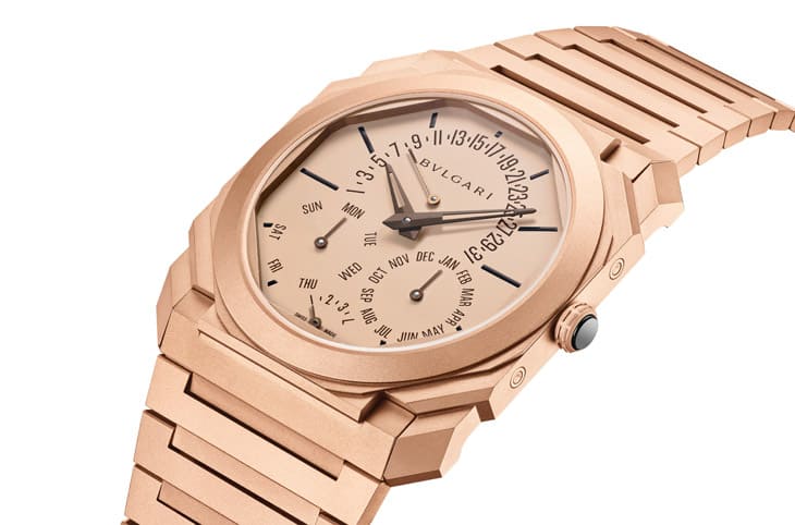万年历向来是高级制表的门槛之一,这项复杂功能必须计算闰年与大小月,精度可达1461天几乎不需调校。宝格丽在2021年就以钛金属版本的万年历打破最薄纪录,如今则将这项成就用玫瑰金重新演绎,带来截然不同的视觉质感。新款手表採用微珠喷砂处理的玫瑰金表壳与链带,直径40mm、厚度只有仅5.80mm,这种表面处理打破金属光泽既有印象,呈现低调雾面质感,也呼应宝格丽设计总监Fabrizio Buonamassa Stigliani一贯主张的单色设计风格。